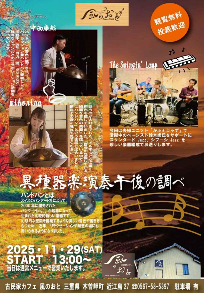 秋の空気が少しずつ深まってきましたね。 そんな季節にぴったりの古民家ライブに、ジプシージャズのバンド、TheSwingin’Lampさんでベースサポートとして参加させていただきます。